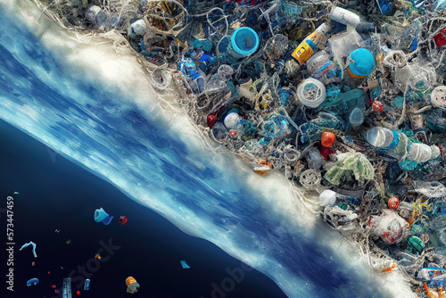 Top view of lots of plastic waste at the shore and in the ocean (Generative AI)