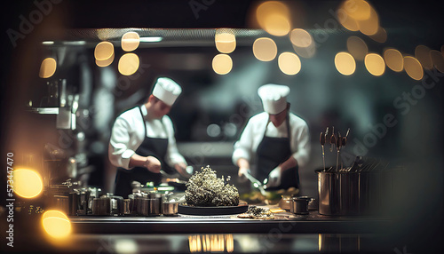 Illustration of professional chefs cooking in restaurant kitchen with bokeh and flames (Generative AI)