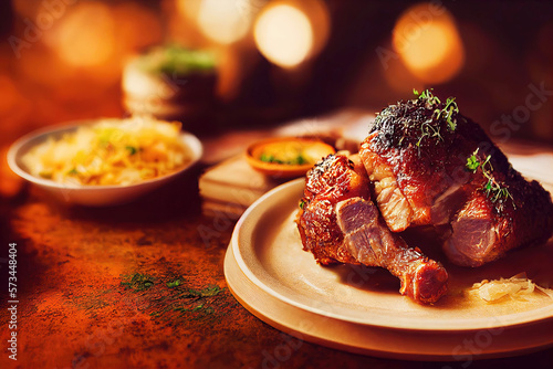 Close-up of grilled knuckle of pork with sauerkraut as German food illustration (Generative AI)