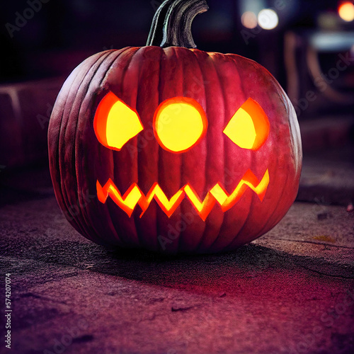 Glowing carved Halloween pumpkin in a dark eerie setting