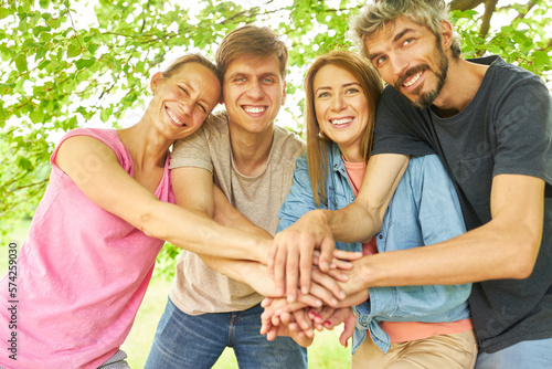 Freunde beim Hände stapeln im Outdoor Workshop