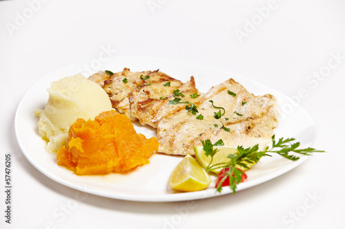 Top view of delicious nasi goreng with fried egg and fresh vegetables on white plate