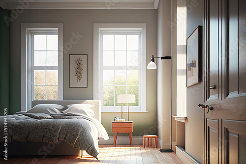 Bright cozy bedroom with minimalist decoration and furniture as digital interior design concept illustration (Generative AI)