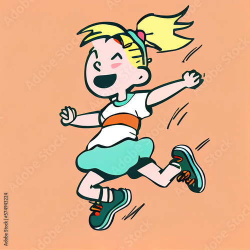 Active cartoon girl running and jumping with joy (Generative AI)