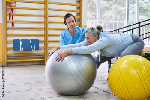 Physiotherapist guiding elderly patient exercising with fitness ball