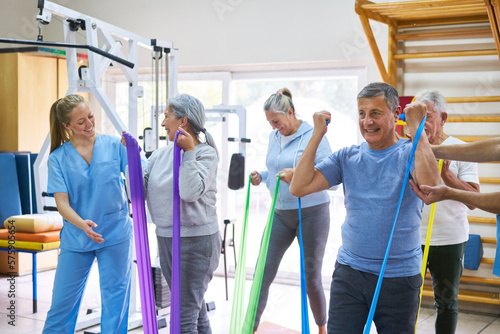 Physiotherapist assisting elderly woman in movement therapy at rehab center