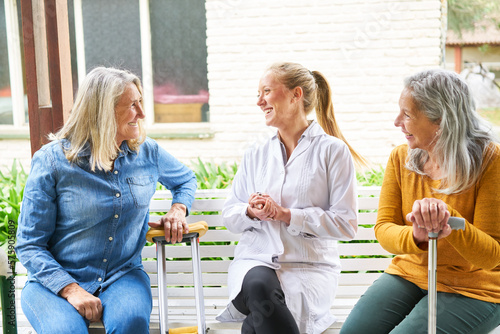 Nurse explaining senior women sitting on bench