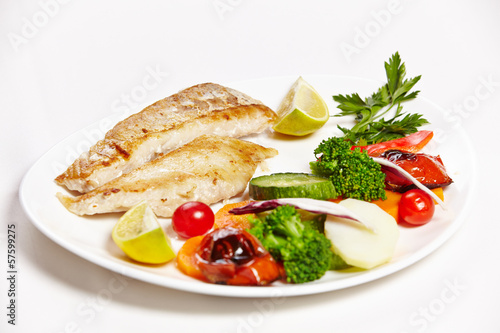 Top view of delicious beer-battered fish with french fries and peas on a plate