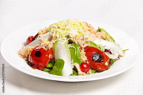 Fresh caprese salad with ripe tomatoes, mozzarella cheese, and basil on a white plate, top view