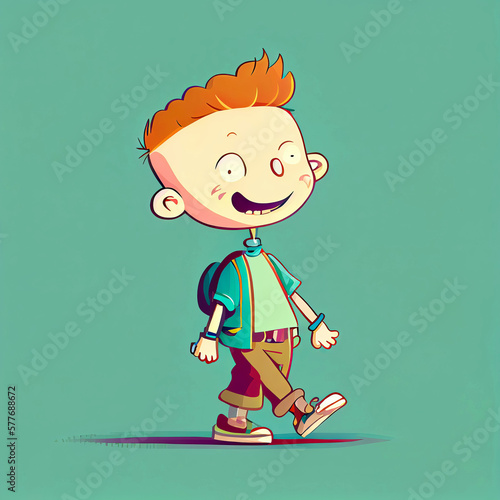 Cute funny cartoon boy walking with backpack to school (Generative AI)