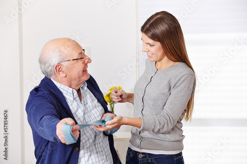 Frau spielt mit Seniorin im Seniorenheim Karten