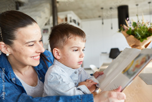 Mother and son read a children's book together