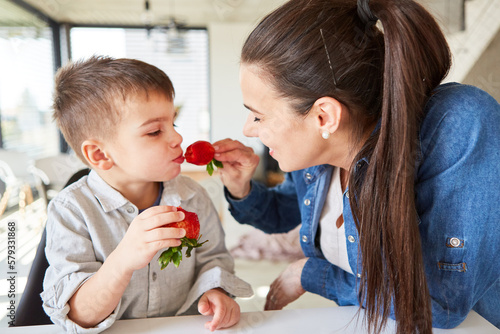 Kleiner Junge füttert Mutter mit frischen Erdbeeren