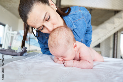 Mutter küsst ihr Baby liebevoll auf die Stirn