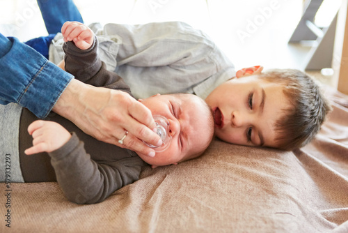 Glückliche Mutter kuschelt mit Baby und großem Bruder