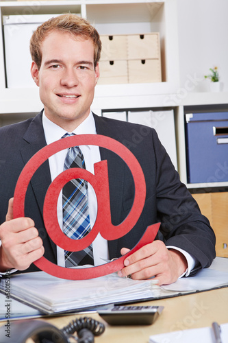 Geschäftsmann hält at-Zeichen als Symbol für Internet