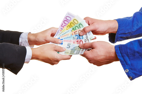 Arbeiter und Geschäftsfrau halten Geldscheine