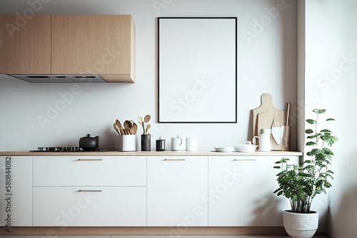 Modern bright minimalist kitchen as interior design illustration and white empty picture frame for mock-up for poster design (Generative AI)