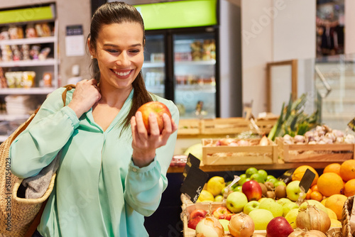 Glückliche Kundin im Supermarkt kauft frische Orangen
