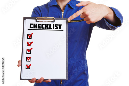 Geschäftsfrau mit Handwerker unterschreibt Auftrag