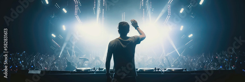 DJ playing techno music with party crowd dancing in club (Generative AI)