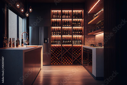 Cozy wine cellar as digital interor design illustration (Generative AI)