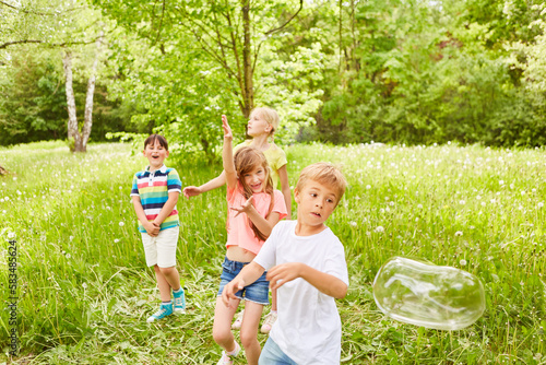 Multiracial children playing with soap bubbles in grass