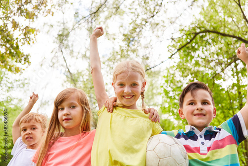 Kids winning soccer game competition in summer at park