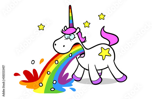 Rosa Cartoon Einhorn beim Kotzen und Kacken von Regenbogen