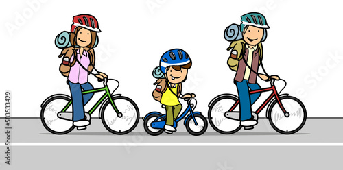 Familie mit Kind fahren bei Ausflug mit Fahrrad auf Straße
