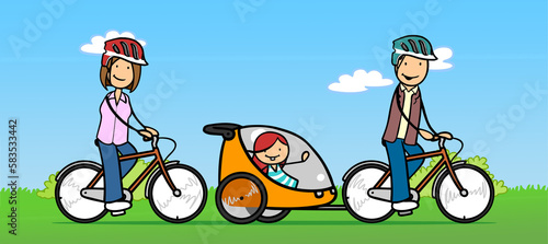 Family riding bikes with child in trailer in nature