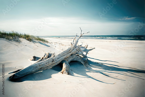 Driftwood on a secluded beach with sand dunes (Generative AI)