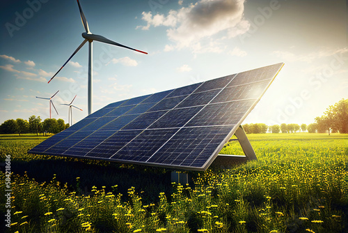Renewable energy solar panel and windmills on summer meadow (Generative AI)