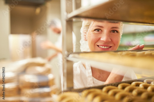Junge Frau als Bäcker Lehrling schaut auf frische Vanillekipferl