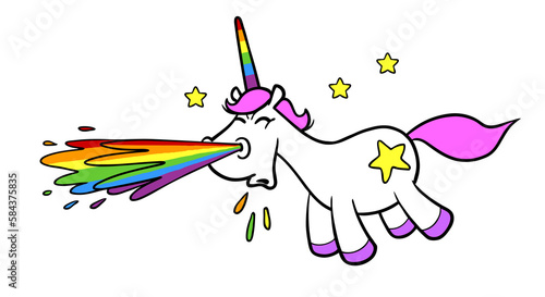 Rosa Cartoon Einhorn beim Kotzen und Kacken von Regenbogen