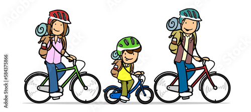 Familie mit Kind fahren bei Ausflug mit Fahrrad auf Straße