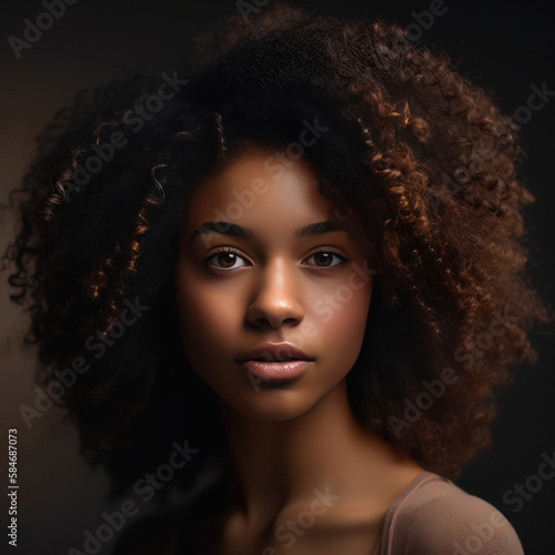 Portrait of a young woman with dark skin and long hair in a studio setting with a dark background, showcasing beauty and confidence.