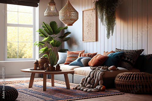 Modern boho style living room as digital interior design illustration (Generative AI)