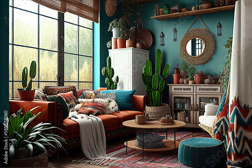Modern boho style living room as digital interior design illustration (Generative AI)