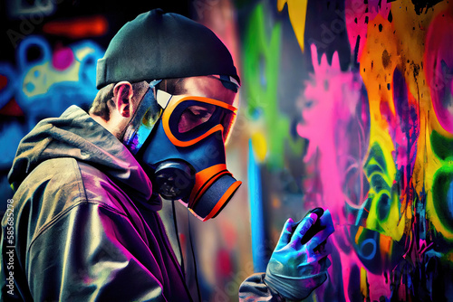 Graffiti sprayer (fictional person) with chemical mask in front of spray paint wall (Generative AI)
