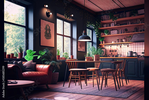 Modern open kitchen and combined dining space and living area or coffee shop interior design illustration (Generative AI)