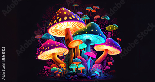 Magical psychedelic mushrooms glowing in trippy colors (Generative AI)