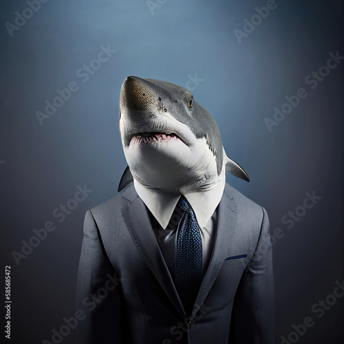 Animal studio portrait of great white shark wearing a business suit (Generative AI)