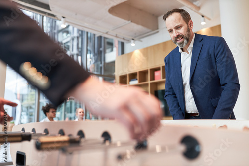Zwei Geschäftsleute spielen Tischfußball am Kickertisch