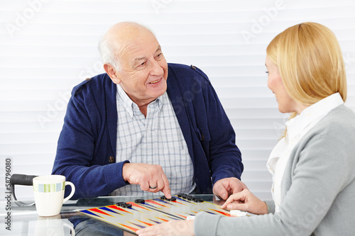 Frau spielt mit Seniorin im Seniorenheim Karten