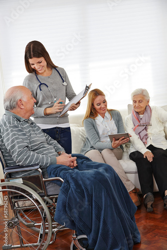 Nurse holding hand of elderly man in wheelchair at rehab center