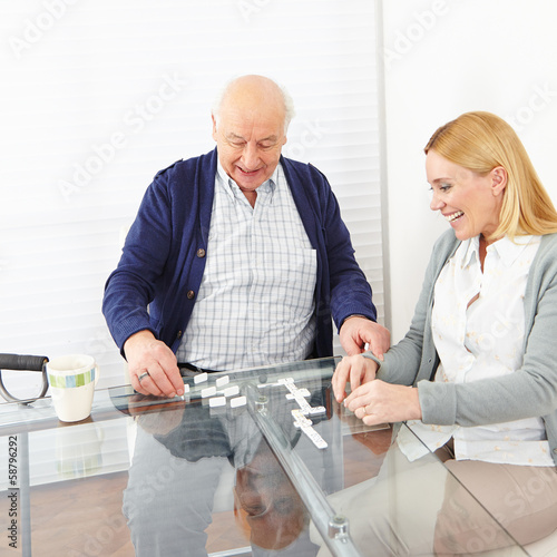 Frau spielt mit Seniorin im Seniorenheim Karten