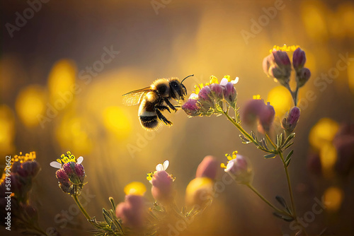 Honey bee flying in flower field (Generative AI)
