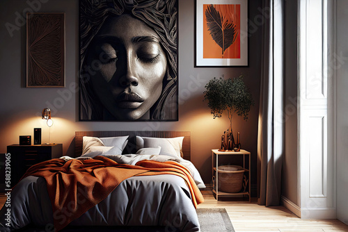 Cozy bedroom with modern decoration and furniture as digital interior design concept illustration (Generative AI)