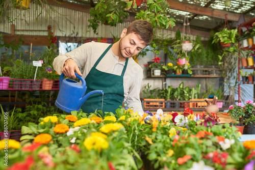 Junger Gärtner mit Gießkanne beim Blumen gießen